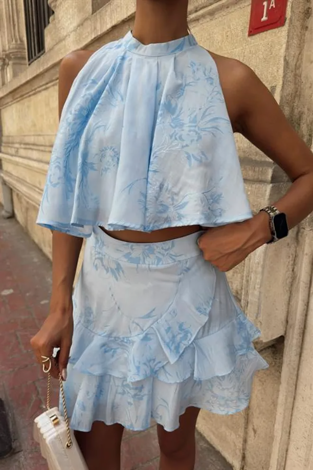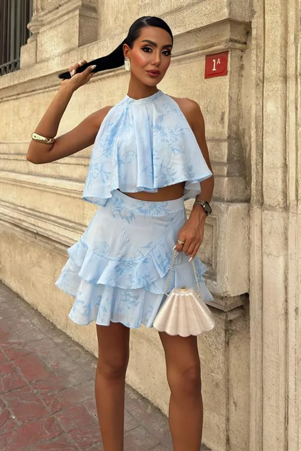 This mini dress is a vision of summer elegance. It features a light blue base with a subtle floral print of delicate white and light blue motifs, creating a monochromatic and romantic look. The tiered ruffled layers add volume and movement, making it perfect for warm-weather events.