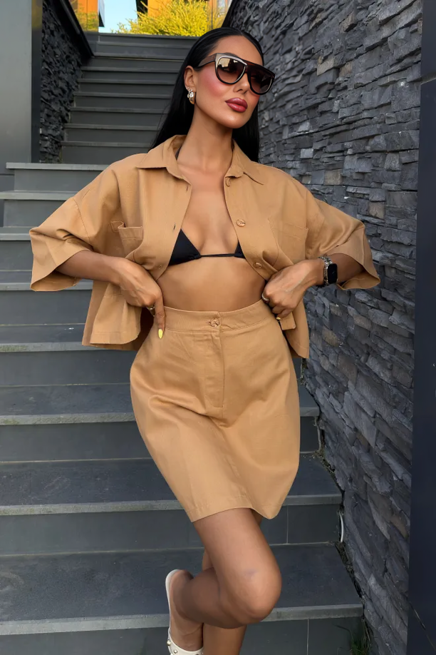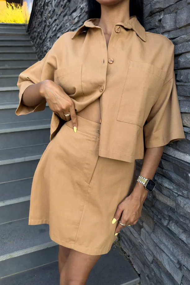 This chic mini dress in a solid camel color offers an effortlessly sophisticated look. With a structured cotton fabric and clean lines, it combines the style of a dress shirt with the charm of a mini skirt, perfect for daytime events.